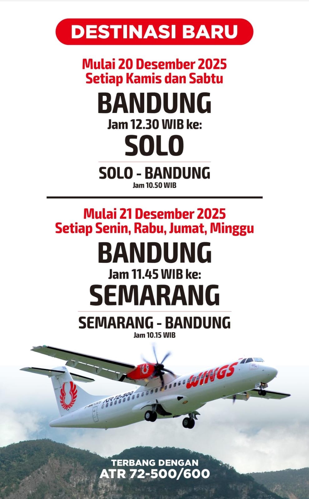 Langit Bandung kembali akan dihiasi oleh  Wings Air  mulai 20 Desember 2025 yang membuka tiga rute baru dari Bandar Udara Husein Sastranegara (BDO) menuju menuju Solo (SOC), Semarang (SRG), dan Surabaya (SUB).